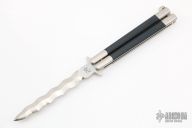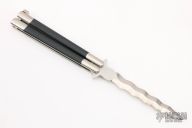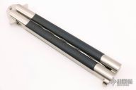 This balisong by 29 Knives has a satin finished kris blade with 303 stainless steel handles having dovetailed carbon fiber inserts. Excellent work. Comes with zippered pouch and COA. Excellent condition.