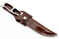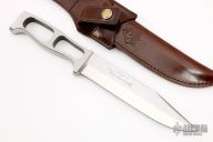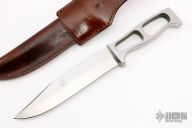This German Expedition Knife features a satin finished clip point blade, .220" blade stock and 1.564" blade depth at the ricasso, integral construction. The handle is satin finished stainless steel. Comes with a brown leather sheath. Excellent condition. #1560 on handle.