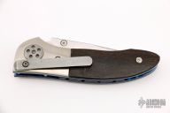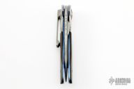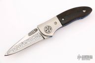 The Python from Allen Elishewitz features a Damascus drop point edge with a false top edge and notched flipper. The handle features satin polish titanium bolsters complemented by wood scales over anodized jeweled titanium liners.  Stainless tip down pocket clip. Comes with zipper case. Light scuffs and scratches are visible. Good condition.