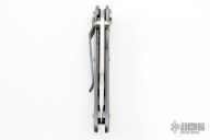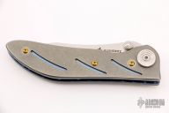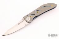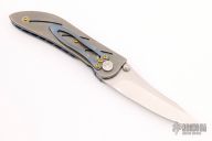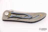 This early folder by Allen Elishewitz has an upswept clip point blade with dual thumbstud. The handle has orange peel finished titanium scales with anodized titanium liners and gold plated screw, blue anodized titanium clip. Nice smooth action, good lockup, great detent, and seating. Comes with a soft pouch. Has some scratches, otherwise excellent condition.
