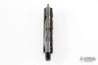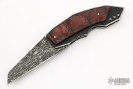 This Snout flipper by Corrie Schoeman features a Pieter Goosen Damascus blade with fileworked thumb and finger rests, has swedge and flipper. The handle has crocodile skin over black G-10, fileworked and orange peel finished titanium liners, titanium backspacer, tip down carbon fiber clip. Rides on caged bearings, nice detent, lockup and blade seating. Comes with COA dated Jan 2022. New from maker.