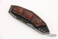 "I started making knives over 30 years ago while at University. My first knife was a big Bowie made from a car spring and I obtained a piece of stag from the local zoo for the handle. I still have and treasure that first knife. In my younger days I was very involved in martial arts yet could not buy Japanese weapons to train with, so I made my own, a short sword called a "sai". My fellow students were enthralled and I began taking orders to make more. Although having earned two university degrees, I continued to make knives part-time, but it became such a passion that I left my profession and am now a full-time knifemaking artist. I have been a member of the South African Knifemakers Guild since 1985. Today I only make folders and automatics, using the best exotic materials such as mammoth ivory, pearl, damascus and damasteel. All my folders have fileworked liners and backstraps, each folder has a jewel inlaid somewhere on the knife as well as in the thumbstud."