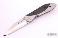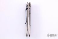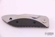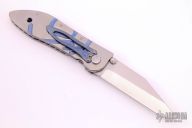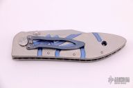 This folder by Allen Elishewitz has a tanto blade with dual thumbstud. The handle has titanium scales, with carbon fiber inlay, with anodized titanium liners and gold plated screw, blue anodized titanium clip. Nice smooth action, good lockup, great detent, and seating. Comes with nylon sheath. Has some scratches, otherwise excellent condition.
