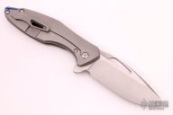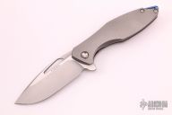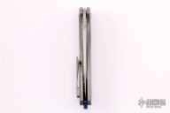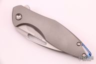 This Arius by Koenig knives features a two-tone blade with thumbhole and flipper. The handle has a nicely milled titanium frame with a titanium tip up clip, blue anodized titanium backspacer. Has ceramic bearings and a ceramic detent ball. Nice detent, lockup and blade seating. Comes with original box and COA dated April 28nd, 2021. Comes with a set of anodized titanium screws. Excellent condition.