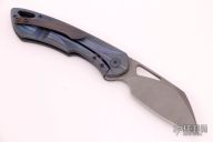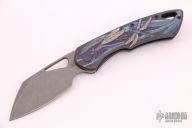 This Whippersnapper from Olamic Cutlery features a stonewash finished blade, thumbhole, notched thumbrest and front flipper. The titanium frame has been hand carved with a Dragonfly theme by Andrey Kolesnikov, pocket clip is positioned for tip up carry, floating titanium backspacer. Blade is centered when closed and locks up with no play. Comes with maker's card with a serial number of WS450-S and dated 2/5/2021. Includes a padded zippered case. Excellent condition.