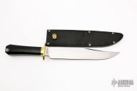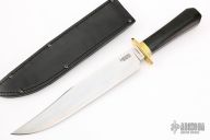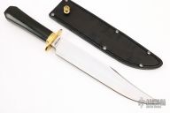 "Awesome is the only adjective that even begins to describe our Laredo Bowie. In fact, it really has to be seen to be appreciated, since mere words just don’t do it justice. It features a long, heavy blade made from vacuum heat-treated VG-1 San Mai III® blade construction, which is flat ground to produce incredible cutting power and perfect balance. And, as an added bonus, it is given an absolutely ferocious cutting edge that terminates in a dagger sharp point. To further enhance its versatility and efficiency as a weapon, it sports a four and a half inch long sharpened clip point that helps facilitate the deadly back cut, as well as a wide variety of more conventional cuts and stabbing attacks. The rich, polished black Micarta handle is as tough as it is beautiful. It is specially contoured to fit the hand like a glove and to provide a positive grip when cutting, chopping or thrusting. To complement the Laredo’s incredibly sharp blade and superb handle, we have carefully forged a unique guard and integral bolster out of a single piece of brass. Both bolster and guard are handsomely detailed and are finished with a fine mirror polish. To keep your Laredo Bowie safely at your side and ready for action, we have provided a traditionally styled black leather scabbard that features heavy stitching, brass rivets, thick leather, and a convenient brass belt peg so you can safely slip the sheath under your belt." Includes original packaging and sheath. Excellent condition.