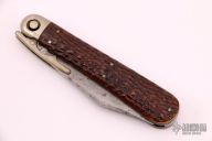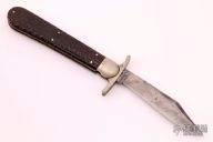 This vintage auto by Press Button Knife Co features a clip point blade, nickel silver bolsters and swing guard, jigged bone scales, steel liners and backspacer. Has patina and scratches, has been resharpened, fair condition and function for its age.