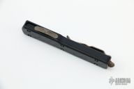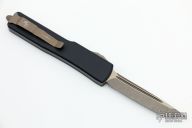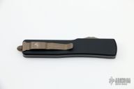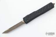 This UTX-70 OTF automatic by Microtech features a T/E bronzed tumble finished blade with a standard edge. The handle has a carbon fiber top, and black aluminum frame with matching stainless steel tip down clip. Serial number 128 and dated 10/2021. Comes with original box and papers. Excellent condition.