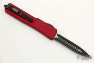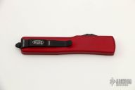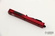 This UTX-70 OTF automatic features a D/E black finish blade with a standard edge. Stainless steel clip. Red aluminum frame. S/N 210055. Dated 01/2021. Comes with original box and papers. Excellent Condition.