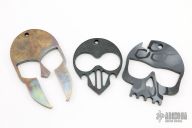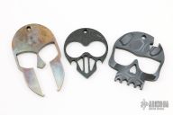 3 sets of knuckles by unknown makers. The bronze helmet is titanium, the skull with hex opening for teeth is steel with a coating, the black one looks like it has been force patinad and then coated black on the front and back, the edges look force patinad copper to me. They have a few light scratches, otherwise excellent condition.