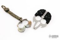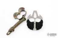 2 sets of knuckles by unknown makers. The two-finger with the holes together is .484" thick titanium, the other one has black paracord wrap and I think it is probably a non ferrous steel because it is not magnetic, but I think it is too heavy to be titanium. They have a few light scratches, otherwise excellent condition.