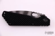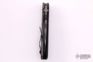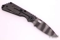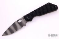 This SNG framelock folder by Mick Strider features a tiger stripe blade and a dimple pattern black G-10 and flamed titanium frame and tip up titanium clip. Includes a "Lock Bar Stabilizer" for maximum reverse lock retention. Nice detent, lockup and blade seating. New condition.