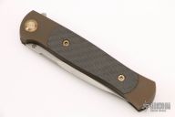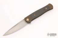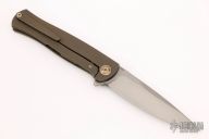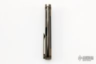 This Pike from Alexander Cheburkov features a drop point matte finish blade with swedge, notched thumbrest and flipper. The handle is comprised of anodized titanium double bolsters, carbon fiber scales over titanium liner, backspacer and lockside. Matching tip up clip. Great blade seating, detent and lock up. Includes original box and COA. Excellent condition.