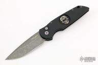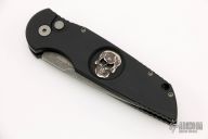 This Tactical Response TR-3 by Pro-Tech black anodized aluminum body, which provides good traction and looks great. The blade is acid wash finished 154-CM stainless steel with a plain cutting edge. The TR-3 is a knife that won't let you down. It fires hard, locks up like a rock, and feels great in hand. The slim design sits comfortably for tip-up pocket carry. Black Lip Pearl is inset into the firing button, adding a unique and awesome flare to the piece. Sterling Silver Skull in handle. Comes with original box and papers. Excellent condition. #18