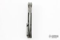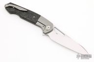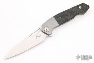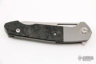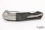 The Eraser flipper is a slim EDC design from Liong Mah Design. It has a titanium handle with a marbled carbon fiber overlay, leaving the bolster uncovered. It sports a Bohler M390 steel blade that has a strip of jimping along the spine. This impressive design is rounded off with a milled pocket clip, a hidden lanyard tube, and a milled backspacer. Features: Ball-bearing pivot offers swift, responsive blade deployment. Titanium frame provides a durable, lightweight build. M390 blade steel offers a excellent cutting performance and edge retention. Comes with original zippered case. Excellent condition.