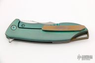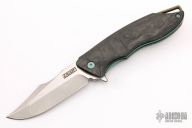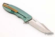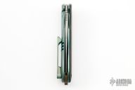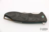 This S7 flipper by Michael Zieba features a two-tone blade with a notched thumbrest and a flipper. The handle has a marble carbon fiber and anodized titanium frame, black backspacer and an anodized titanium tip up clip with hidden screws. Nice detent, lockup and blade seating. Rides on bearings. Has stainless lockbar insert. Comes with original box and COA dated 1-24-19. Has a couple light scratches, otherwise excellent condition.