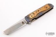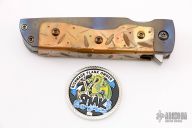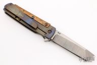 This Large Stingray Steamer flipper by RichMade Knives features a drop point tanto style D2 blade with satin flats and a flipper. The handle has a tumble finish titanium frame with copper overlay and a laser engraved tip up clip. Great blade seating, detent and lock up, rides on bearings. Includes a zippered case and COA dated 5/2021. Excellent condition.