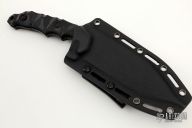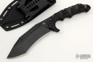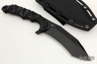 This knife by Lotar Combat features a black recurve blade with a notched thumbrest and full tang construction.  .241"Blade Stock. 1.53" Blade Depth.  The handle has contoured black G-10 scales.  Includes a black kydex sheath.  Excellent Condition.