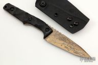 This Huginn EDC by Bawidamann Blades was named after Odin’s Raven. It features acid etch patina finish on the blade, has notched thumbrest, .104" blade stock and 1.210" blade depth, full tang construction. The handle has IM Bawidamann Chunked Pattern Carbon Fiber scales (proprietary Carbon fiber composite). Comes ready to carry with the Bawidamann Uberscabbard. New from maker.