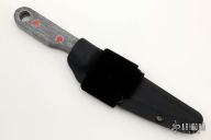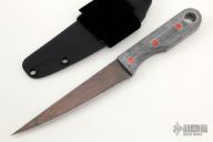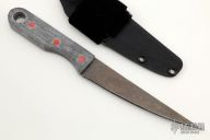 This Fillet Knife by John Gray features an anodized titanium blade with a right-hand chisel ground blade, .038" blade stock and .958" blade depth, full tang construction. The handle has black terotuff micarta scales with orange G-10 pins and a large lanyard hole. Comes with a kydex sheath with Velcro loop. New from maker at the 2022 LVCKS. This knife has alot of flex in the blade!