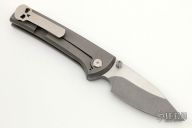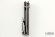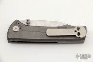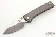This Custom Scapegoat by Ramon Chavez features a two-tone finished blade with dual thumbstuds. The handle has a stonewashed titanium frame and a matching backspacer, orange peel finished skull pocket clip. It includes the original box and handkerchief. Excellent condition. #57 inside backspacer.