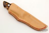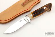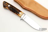 This Loveless Style Drop Point by Mitch Jenkins features a mirror polished blade, mirror polished 416 stainless steel fittings, and amber stag scales with red liners, .208" blade thickness and 1.024" blade depth, full tapered tang. Excellent fit and finish. Comes with brown leather sheath. New from maker at the 2022 LVCKS.