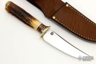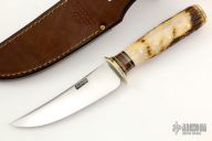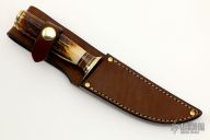 This Deer and Trout Knife by Jim Behring "Treeman" features a convex ground satin finished blade with .099" blade stock and 1.057" blade depth, hidden tang construction. The handle has a brass guard with a red stag grip with finger grooves, brass butt cap and a black/red/brass spacer pattern. Comes with a brown leather sheath. New from maker.