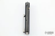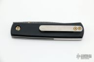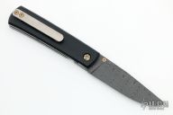 This linerlock folder by Ambrose Knives features a Vegas Forge Stainless Damascus blade with a single orange peel finished and anodized titanium thumbstud. The handle has Westinghouse black linen micarta scales, satin finished titanium liners, orange peel finished titanium backspacer and tip up clip, anodized titanium hardware. Rides on bearings, nice detent, lockup and blade seating. Comes with original box and COA. New from maker at the 2022 LVCKS.