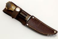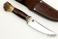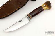 This Bird and Trout by Jim Behring features a satin finished covex ground blade with 0.088" blade stock and .879" blade depth, hidden tang construction. The handle has a nickel silver guard, stacked leather grip with black/yellow/red/blue spacers. Scagel style vintage whitetail deer crotch stag butt. Comes with a brown leather sheath with premium ostrich leg panel. New from maker.