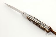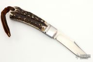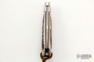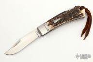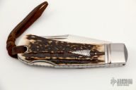 This Lockback from Tobin Hill features a hand rub satin finished clip point blade with nail nick. The handle has pinched and fluted stainless steel bolsters, stag covers with black liners, a textured arrowhead stainless steel escutcheon, stainless steel liners with fileworked spines, stainless steel backspacer/lockbar. Includes padded and zippered case. Brand new from maker at the 2022 LVCKS.