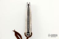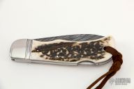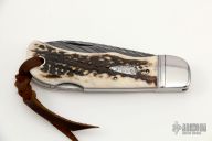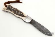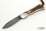 This Lockback from Tobin Hill features a Feather Damascus blade with nail nick. The handle has threaded and fluted stainless steel bolsters, stag covers with black liners, a textured arrowhead stainless steel escutcheon, stainless steel liners and backspacer/lockbar. Includes padded and zippered case. Brand new from maker at the 2022 LVCKS.