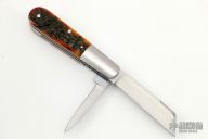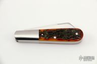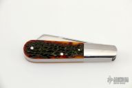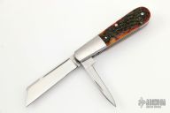 This knife by Bill Ruple features 2 hand rub satin finished blades with a nail nicks. The handle has stainless steel bolsters and liners, jigged bone covers, stainless steel springs. Has half-stops, flush in all positions. Comes with a zippered case. New from maker at the 2022 LVCKS.