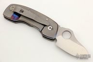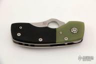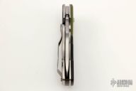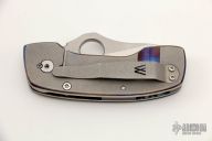 This frame lock by Kevin Wilins features a satin finished blade with a thumbhole and notched thumbrest.  The handle has G10 scales over a stonewashed titanum frame.  Stainless Steel tip up pocket clip and a micarta backspacer.   Excellent condition.