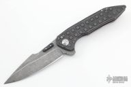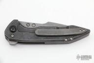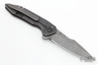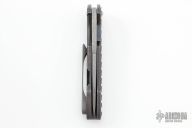 This knife by Nova Blades features a tumble finished blade with false top edge, thumbstud and flipper. The handle has a tumble finished titanium frame with a matching tip up clip, and backspacer. Rides on bearing, nice detent, lockup and blade seating. Has some scuffs and scratches, otherwise great condition.