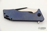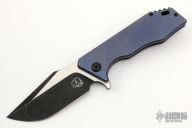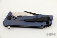This knife from something obscene features a two-tone finish tanto drop point blade with notched thumbramp and flipper tab. Has a tumble and anodize finish handle, with black clip and backspacer. Shows some wear, otherwise excellent condition.