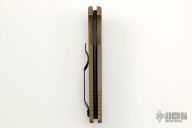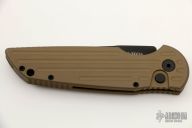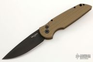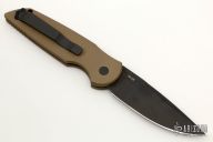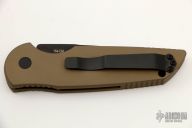 This TR-3 Side Opening Auto has a black coated spear point blade with swedge. Handle is desert sand anodized aluminum with stainless steel tip up clip. Lanyard hole at butt. Comes with original box and papers. Excellent condition.