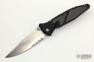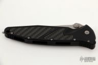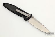This Socom Elite manual linerlock folder by Microtech Knives has a stonewashed partially serrated blade with notched thumbrest and dual thumbstuds. Has a black aluminum handle with non-slip inlays, tip down blasted stainless steel clip. Serial number 033253 and dated 12/2011. Comes with original box, sheath and papers. Excellent condition.