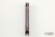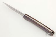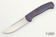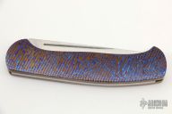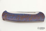 This large slipjoint features a hand rub satin finish blade with milled fuller. The handle is milled timascus with inlaid titanium framing. Stainless steel spring. Heavy pull, lanyard bail. Has some scuffs and scratches otherwise excellent condition. A note from the consignor on this piece: