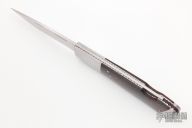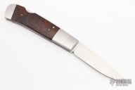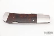 This Lockback folder by Frank Centofante features a hand rub satin finished clip point blade with nail nick. The handle has dovetailed 416 stainless steel bolsters and fileworked 410 stainless steel liners, desert ironwood burl scales, steel lockbar and black linen micarta backspacer. Excellent condition. Comes with a letter from Frank with the specifics on the knife. This knife was made in 1999 and is #083 of this model.