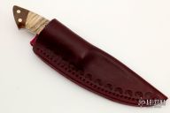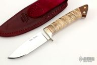 This Hunter by Phillip M Parris features a mirror polished blade with .171" blade stock and 1.079" blade depth, full tapered tang construction. The handle has a nickel silver guard, mammoth tooth scales with red liners and mosaic pins, Amboyna Burl rear bolsters. Comes with a hand tooled maroon leather sheath. Light sheathing marks are visible on the blade and light patina is visible on the guard otherwise the knife is in excellent condition.