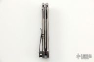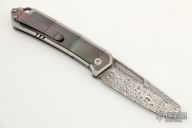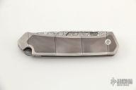 This Slim Utility from Richard Rogers Knives features a clip point Damasteel blade with milled thumb groove with the Rogers logo. The handle is comprised of a milled titanium frame with milled zirconium inlays, zirconium backspacer with lanyard hole, titanium hardware, tip up zirconium clip. The handle has a bamboo pattern. Comes with Velcro case and COA dated December 2021. New from maker at the 2022 TKI (on consignment from another dealer)