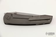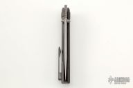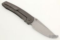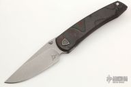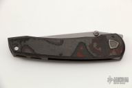 This Waka V3.1 by Edison Barajas features a stonewashed blade with notched thumbrest and dual thumbstuds, can be front flipped. The handle has a black/red carbon fiber and blasted titanium frame with matching backspacer and tip up clip. Has custom pivot. Rides on bearings, nice detent, lockup and blade seating. Comes with original box and COA dated 01-22. New from maker at the 2022 TKI.