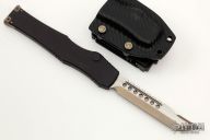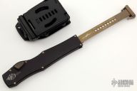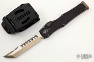 This Halo VI features a bronzed Hellhound tanto blade with satin flats, fullers and notched spine. Its handle is made from black Mil-Spec anodized alloy with bronzed hardware. The charging handle comes marked with the Microtech logo and date of creation along with the serial number. Microtech's Halo VI sets itself apart from previous models with added safety features and an improved charging handle mechanism. The firing button has been upgraded with an integrated safety to prevent accidental deployment. Its upgraded charging handle is built with dual pivoting latches that create a secure seal in the closed position. Comes with original box, kydex sheath and papers. Dated 10/2018. Excellent condition.