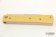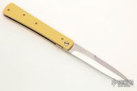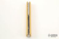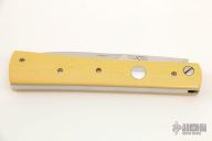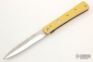 This D&D Fantail Auto by Rainy Vallotton features a mirror finished blade with a false top edge. The handle has yellow paper micarta scales, polished titanium liners with jeweled interiors, and a stainless steel backspacer. Strong and fast leaf-spring opening, nice lockup. Excellent condition.