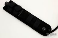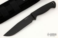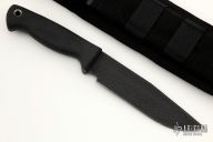 This SYKCO 511 by Scrapyard Knives features a black finished clip point blade, .196" blade stock and 1.369" blade depth, hidden tang construction. The handle is rubber with a lanyard hole. Comes with a black nylon sheath. Excellent condition.