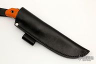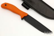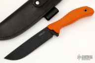 This Safety Mutt by Scrapyard Knives features a drop point black coated blade, .197" blade stock and 1.230" blade depth, hidden tang construction. The handle is high res orange rubber with lanyard hole. Comes with a black leather sheath with belt loop. Excellent condition.