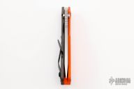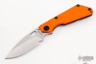 This Mick Strider SNG framelock folder features a stonewashed blade with thumbhole and notched thumbrest. The handle has an orange G-10 and flamed titanium frame with titanium clip, tip up carry. Jimping on blade spine. Nice lockup, and blade seating. Excellent condition.
