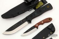 This Fieldcraft Fixed Blade was designed by Brothers of Bushcraft for TOPS knives. It features a two-tone blade with satin grinds with a notched thumbrest. The handle is comprised of black/green G-10 over red liners and full tang construction. The handle features a bow drill divot on both scales and the exposed tang pommel features a divot ground into the tang to allow the scraping of a fire steel without having to leave the blade edge exposed. Includes a black kydex sheath with fire steel holder. Excellent condition.