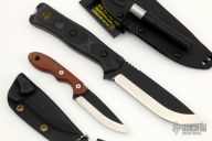 Comes with a Tops MSK 2.5 Neck Knife. Has a two-tone blade with notched thumbrest, .138" blade stock and .851" blade depth, full tang construction with brown canvas micarta scales and red liners. Comes with a kydex neck sheath and whistle. Excellent condition.