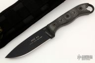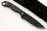 The beautiful lines of this knife were an unintended quality that verifies the saying "form follows function." Another important feature that I built into the knife is that the tip of the blade is lined directly in the center of the handle. This is important because it provides the user with tip awareness similar to an ice pick. For some reason the brain seems to be able to calculate exactly where that tip is even when working blind inside of an animal carcass. This tip awareness is valuable in any combatants' kit because you never know when you may have to transition between opening an MRE and ventilating insurgents. The carabineer hole in the back was never intended to be a gimmick and I don't believe that it is. It was born out of necessity and has proved many times over that it is well worth the small patch of real estate that it occupies in the handle. I discovered many uses for that little hole over the years. It makes a great lever for almost any task requiring a little more leverage, like braking up kindling and fire straightening expedient arrow shafts when they are hot. I have broken the bones of small game to expose the marrow for soups. I have used it to strip small branches clear of twigs and even as a gauge to make a split piece of wood round enough to use for a bow drill. A carabineer clipped in the hole makes a stout handle extension to aid in the blades chopping power when used in conjunction with a rear pinch grip. I have used it as a pot lifter and even to pull stuck tent stakes from the frozen ground. The truth is that the hole is limitless in its possibilities and the more you carry and use this blade the more uses that you will find for it. It is, much like the Marine Scout Sniper, a force multiplier and you will be glad to have it by your side when it matters.